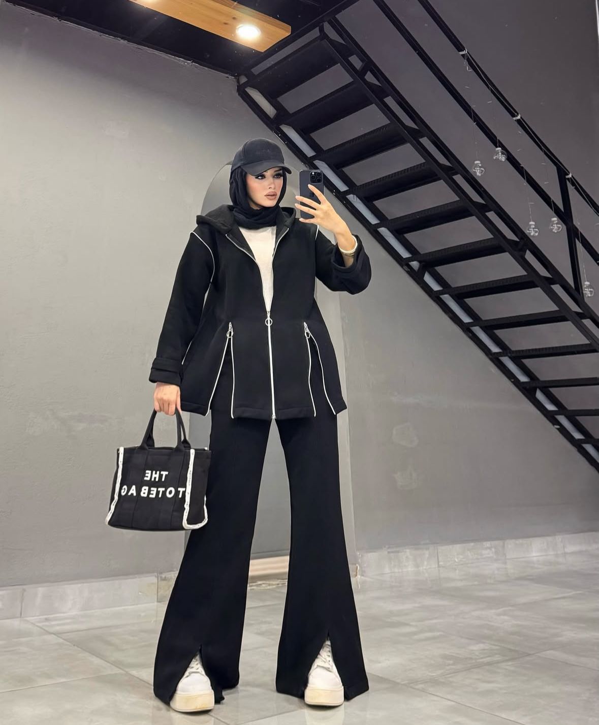 الجاكيت بتفاصيل سحّابات معدنية تضيف لمسة مودرن، والبنطلون بقَصّة واسعة تمنح حرية في الحركة وأناقة في الإطلالة.