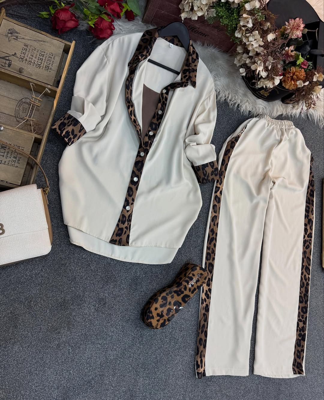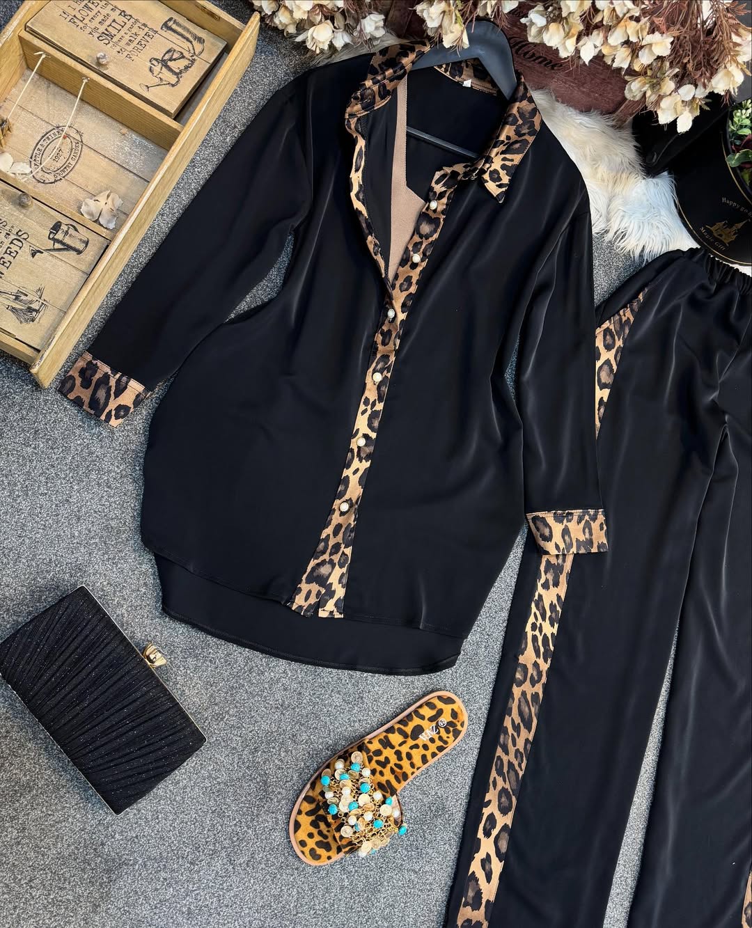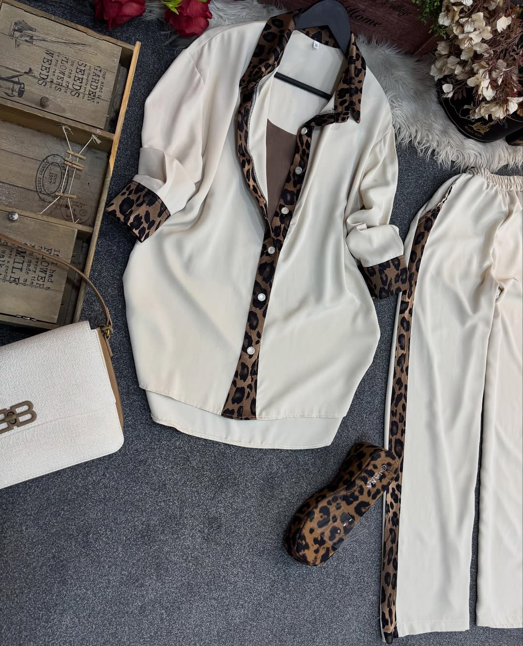تألقي بستايل عصري وجريء مع هذه السوت الأنيقة، المتوفرة بألوان متعددة. يجمع التصميم بين الأناقة والراحة، حيث يأتي بقميص فضفاض وبنطلون بأرجل واسعة، مع لمسة مميزة من نقشة تايجر على الياقة، والأكمام، وجوانب البنطلون. مثالية لإطلالة نهارية أنيقة أو سهرة مميزة. متوفرة بألوان: أسود، أوف وايت، وهافان.