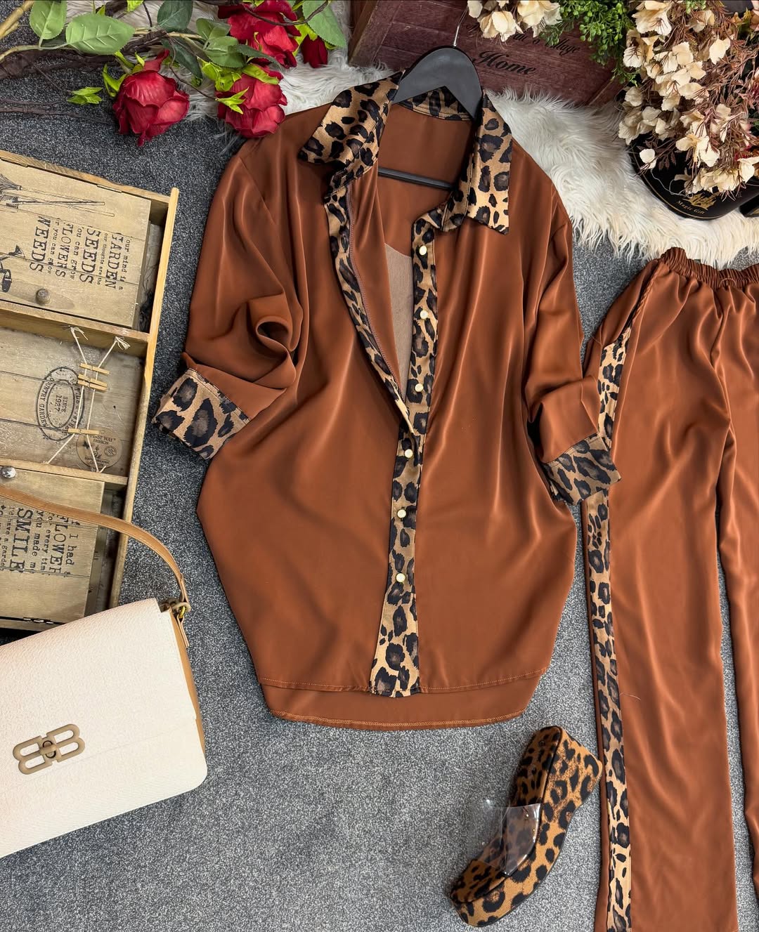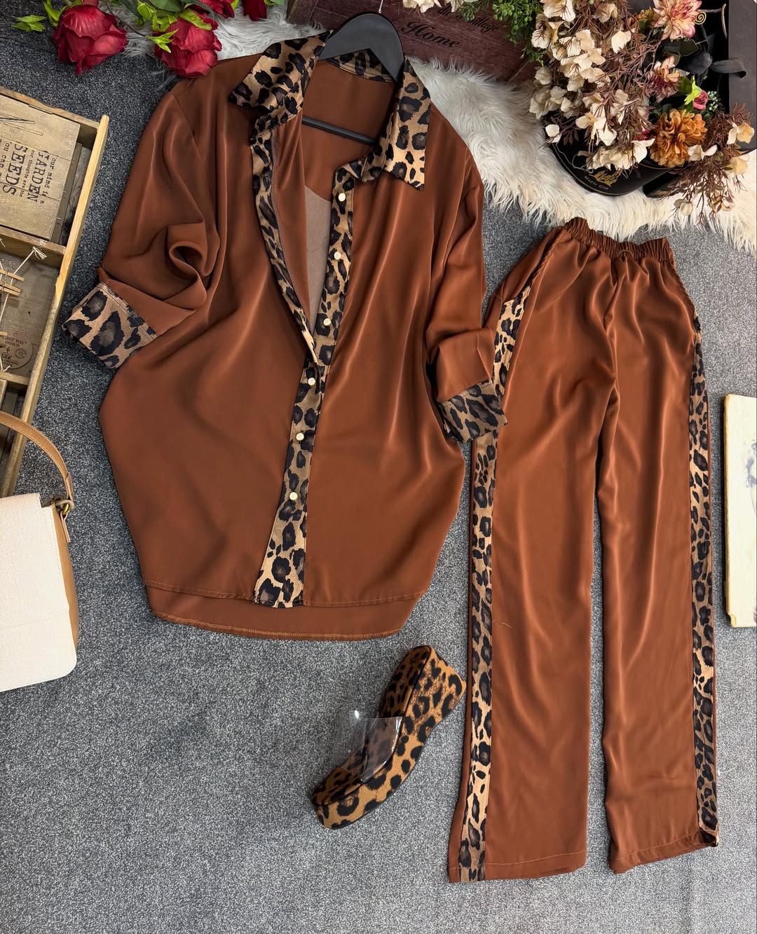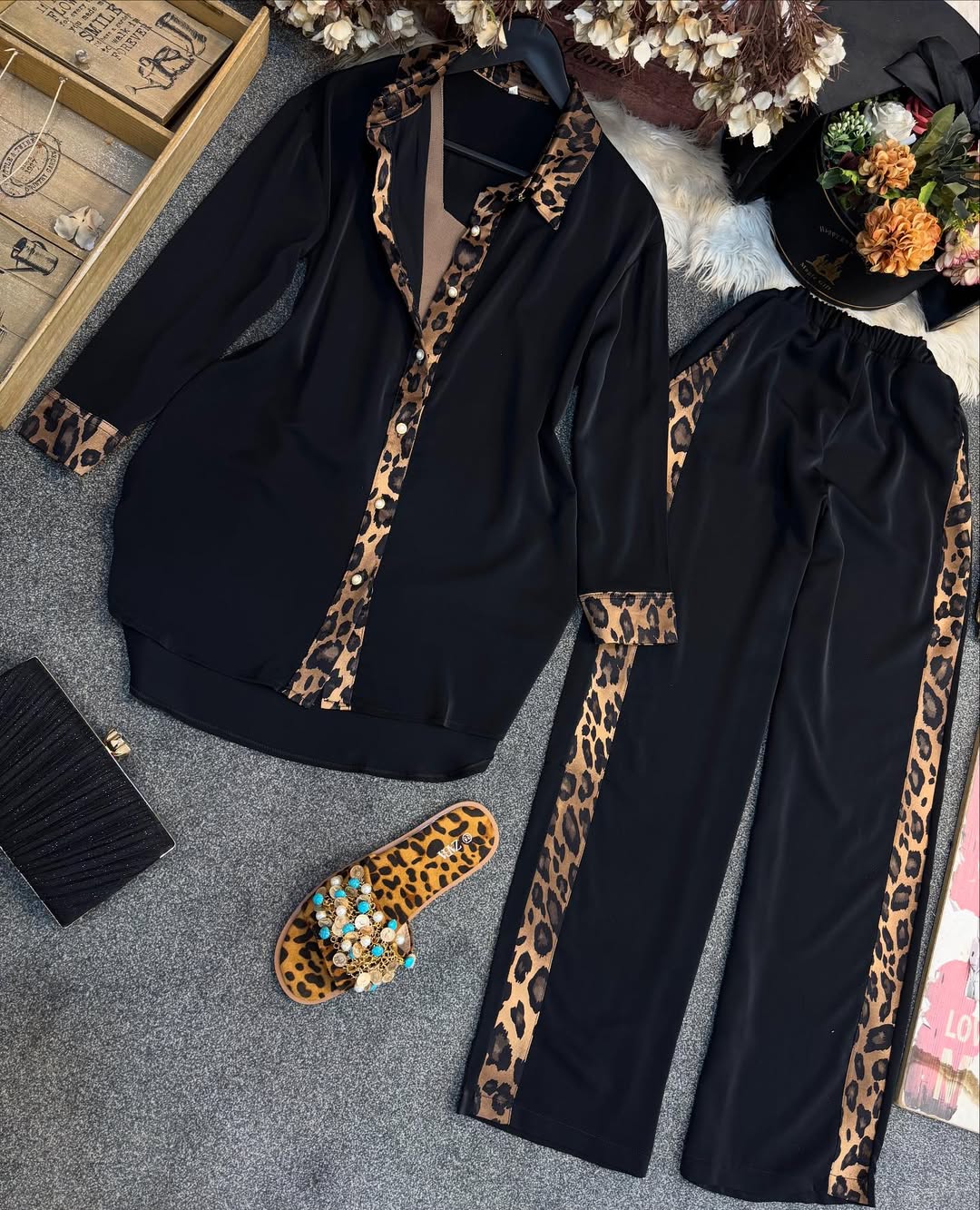 تألقي بستايل عصري وجريء مع هذه السوت الأنيقة، المتوفرة بألوان متعددة. يجمع التصميم بين الأناقة والراحة، حيث يأتي بقميص فضفاض وبنطلون بأرجل واسعة، مع لمسة مميزة من نقشة تايجر على الياقة، والأكمام، وجوانب البنطلون. مثالية لإطلالة نهارية أنيقة أو سهرة مميزة. متوفرة بألوان: أسود، أوف وايت، وهافان.