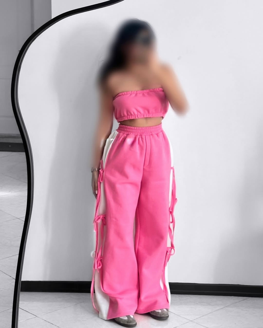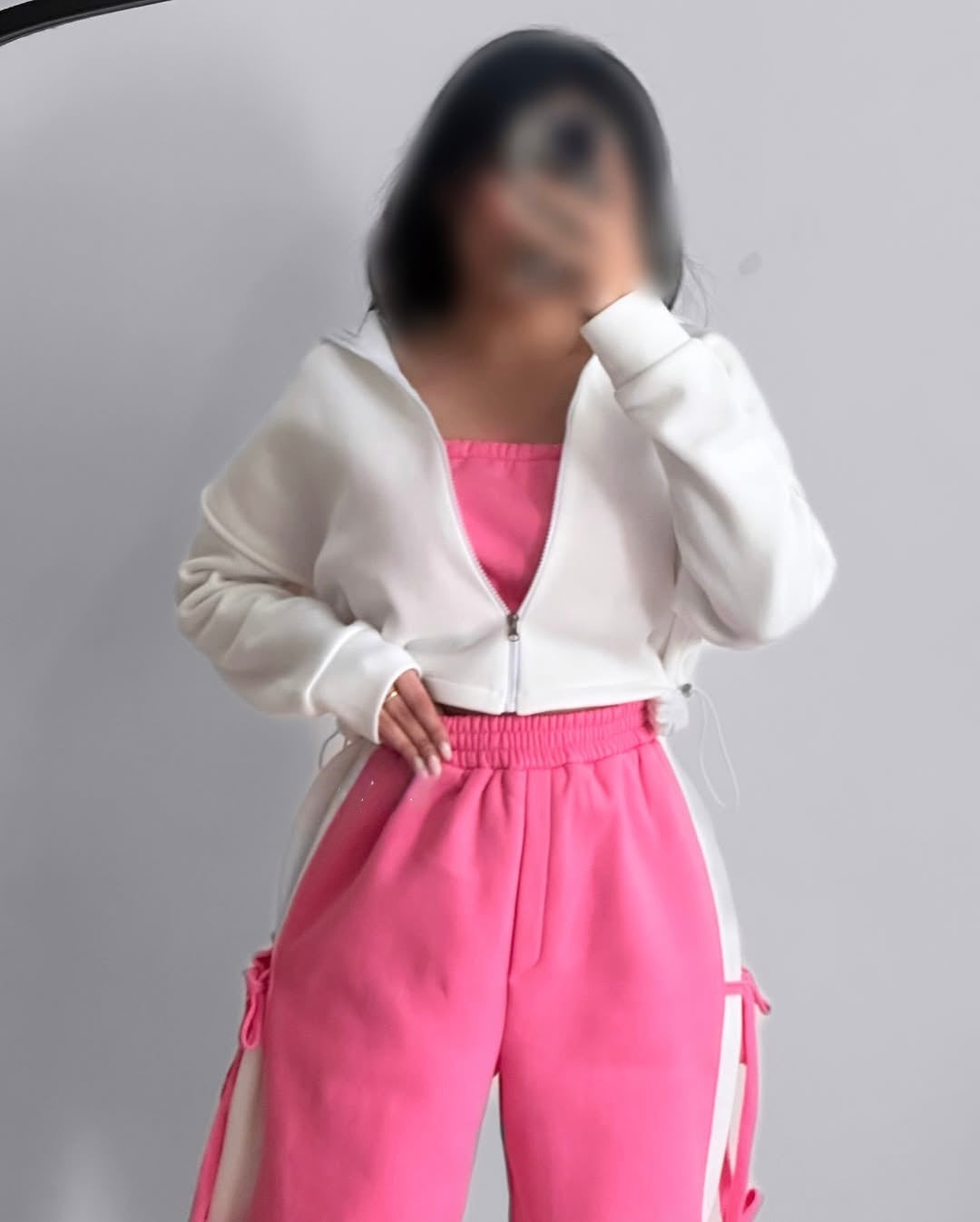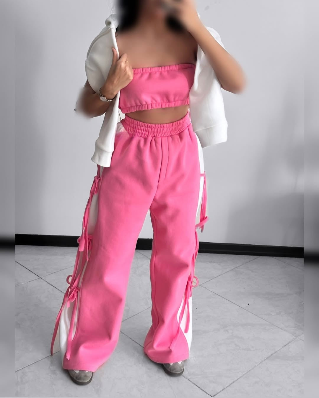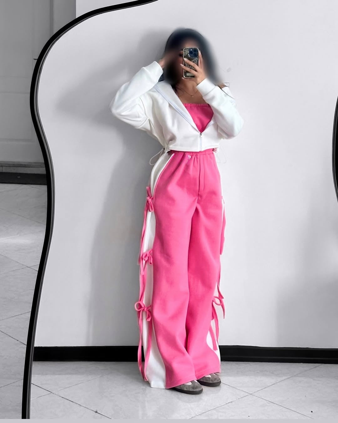 بنطلون بستايل جانبي مع ربطات تضيف لمسة أنثوية و كروب توب عملي و جاكيت بكابيشو مريح